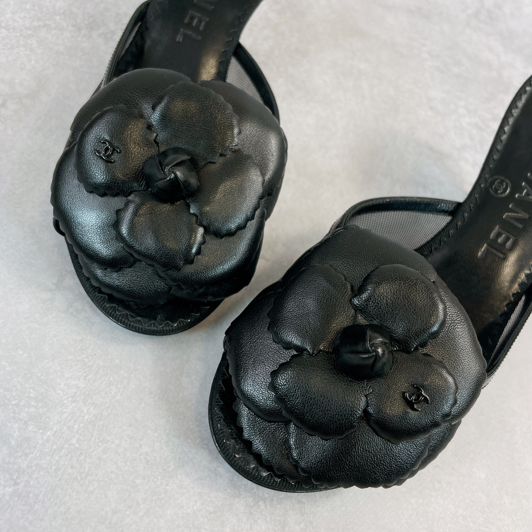 Vintage Chanel Black Camellia Sandal Heels 35 1/2