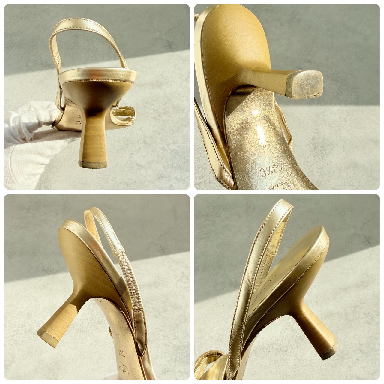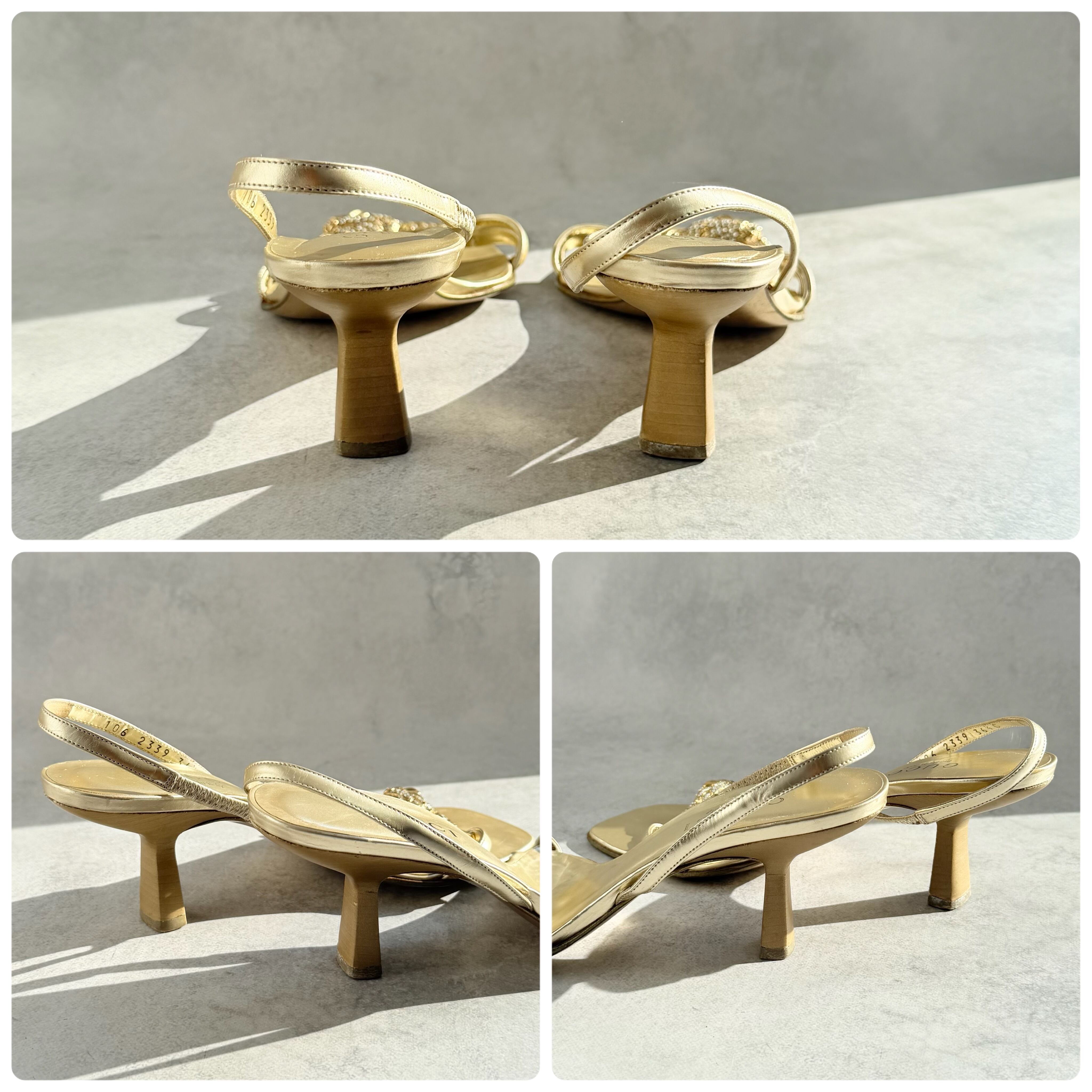 スリングバックストラップに広がりございます。また付け根部分、割れ等無いです。