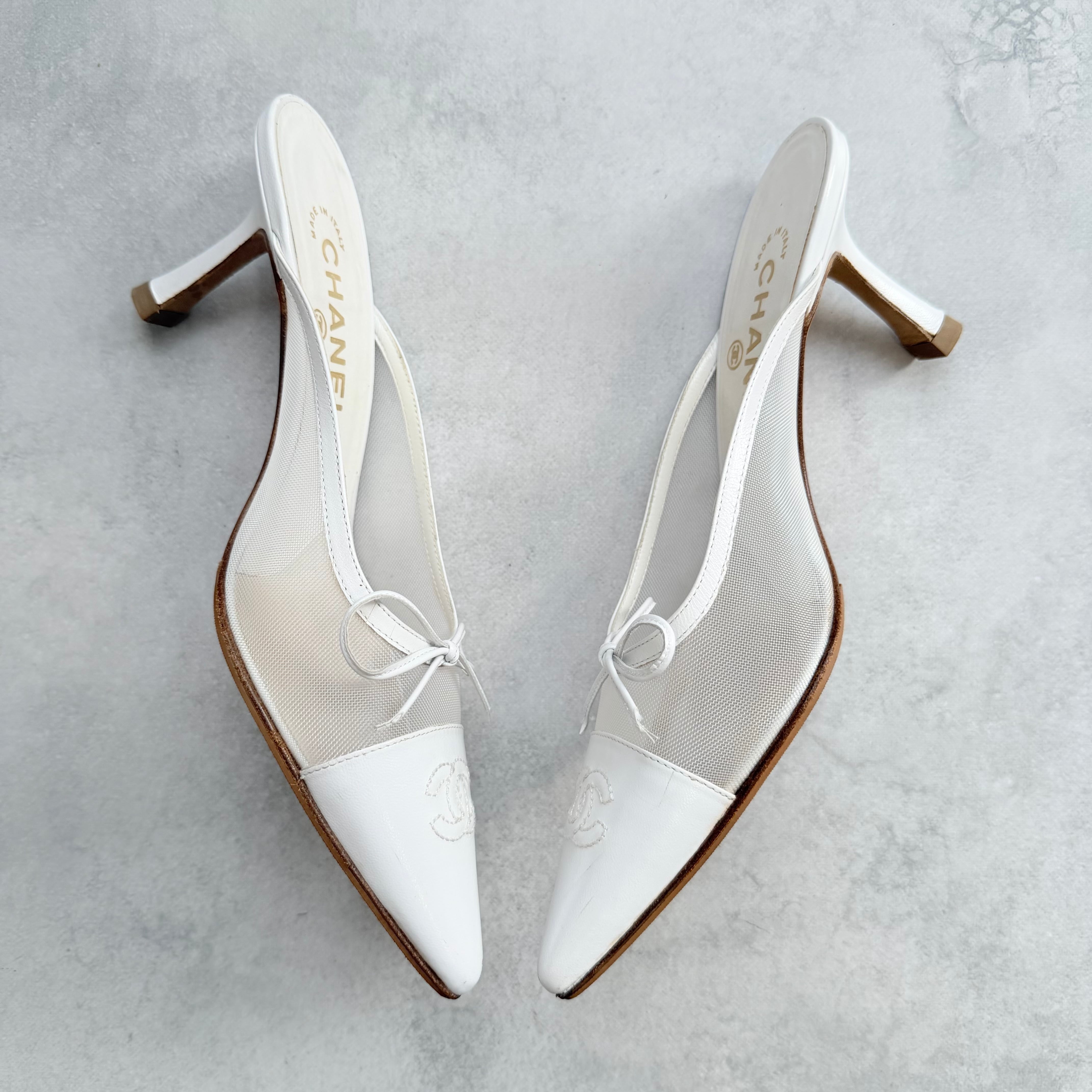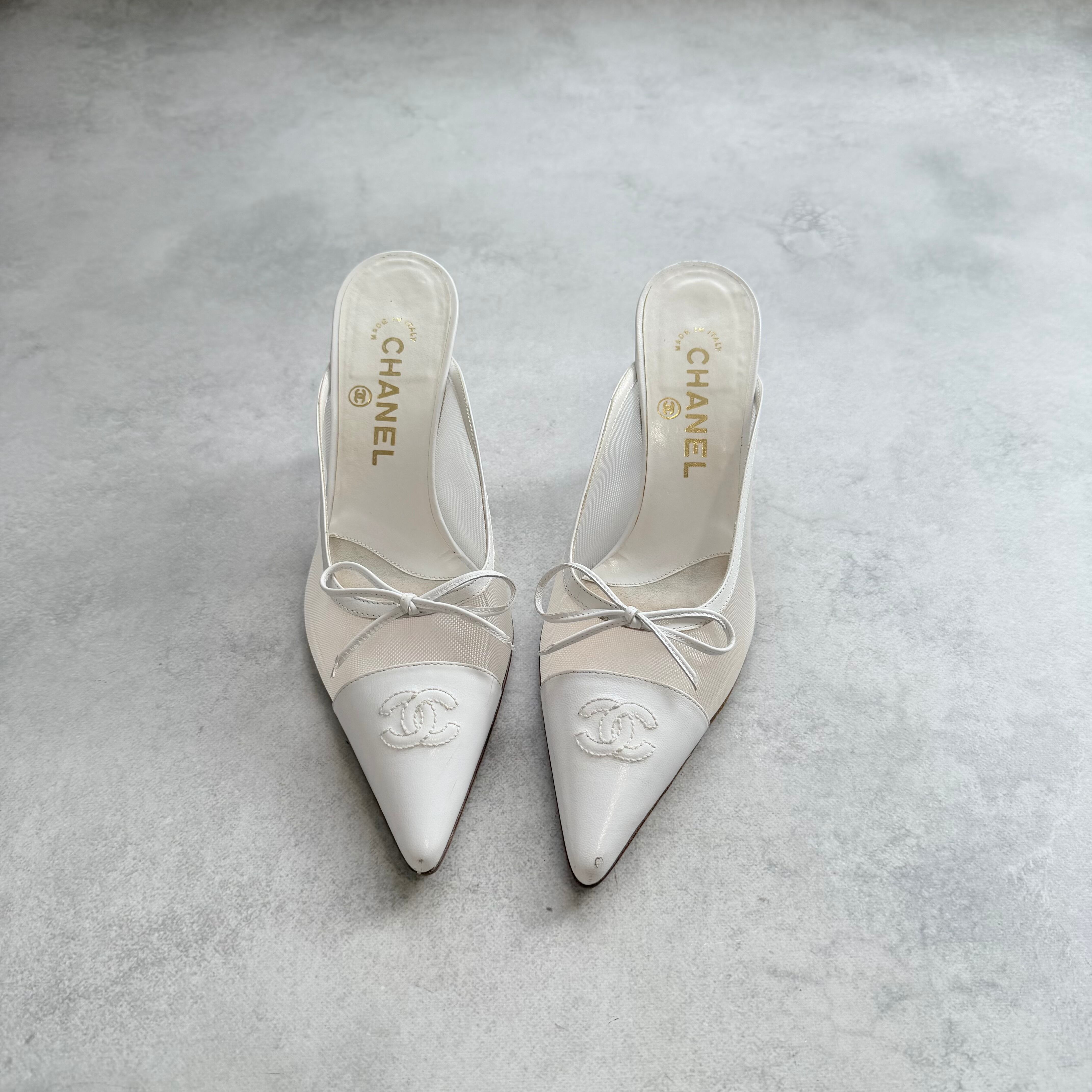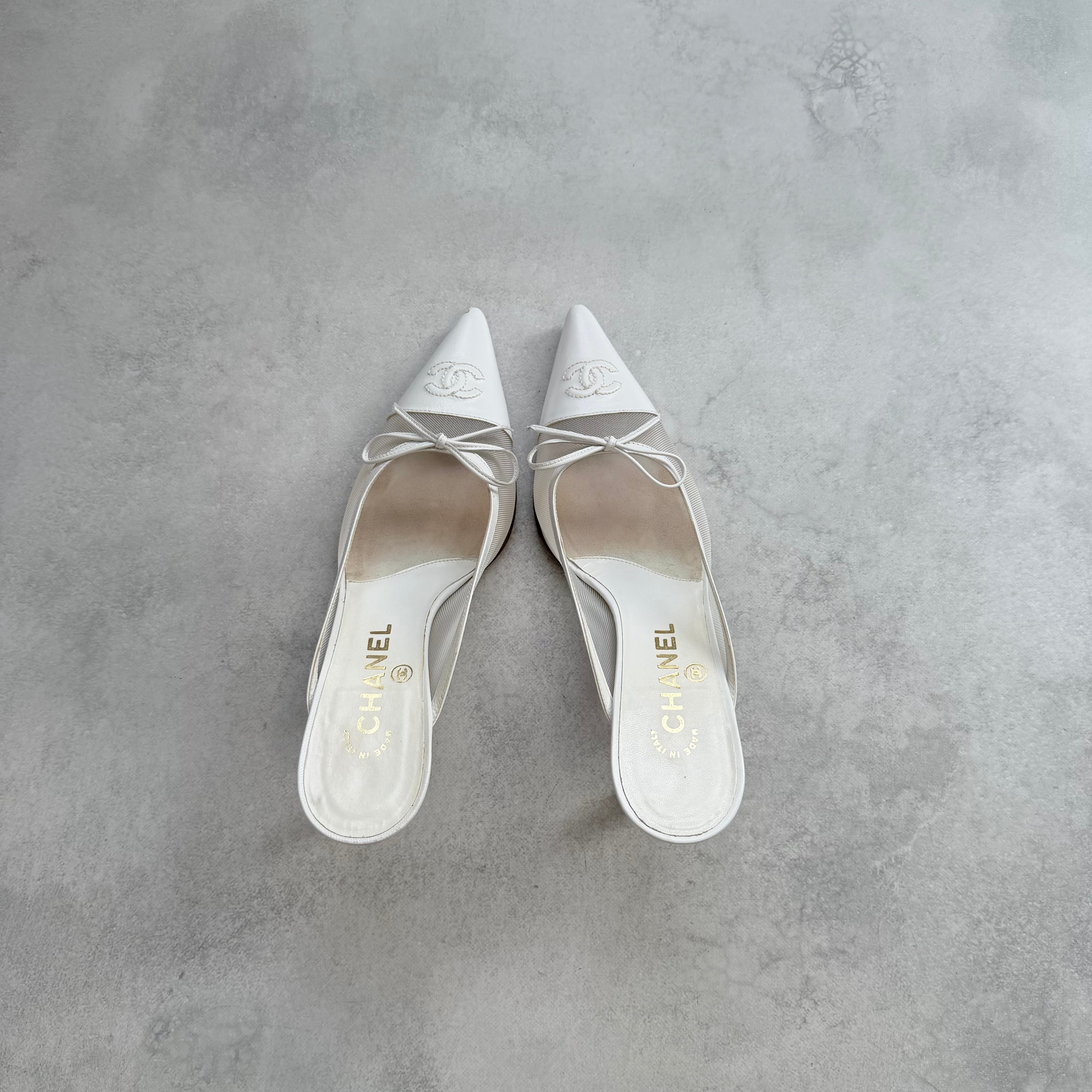 Chanel CC white mesh bow mules 37